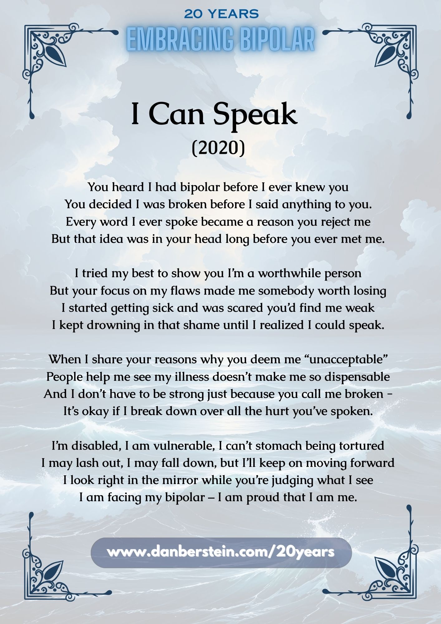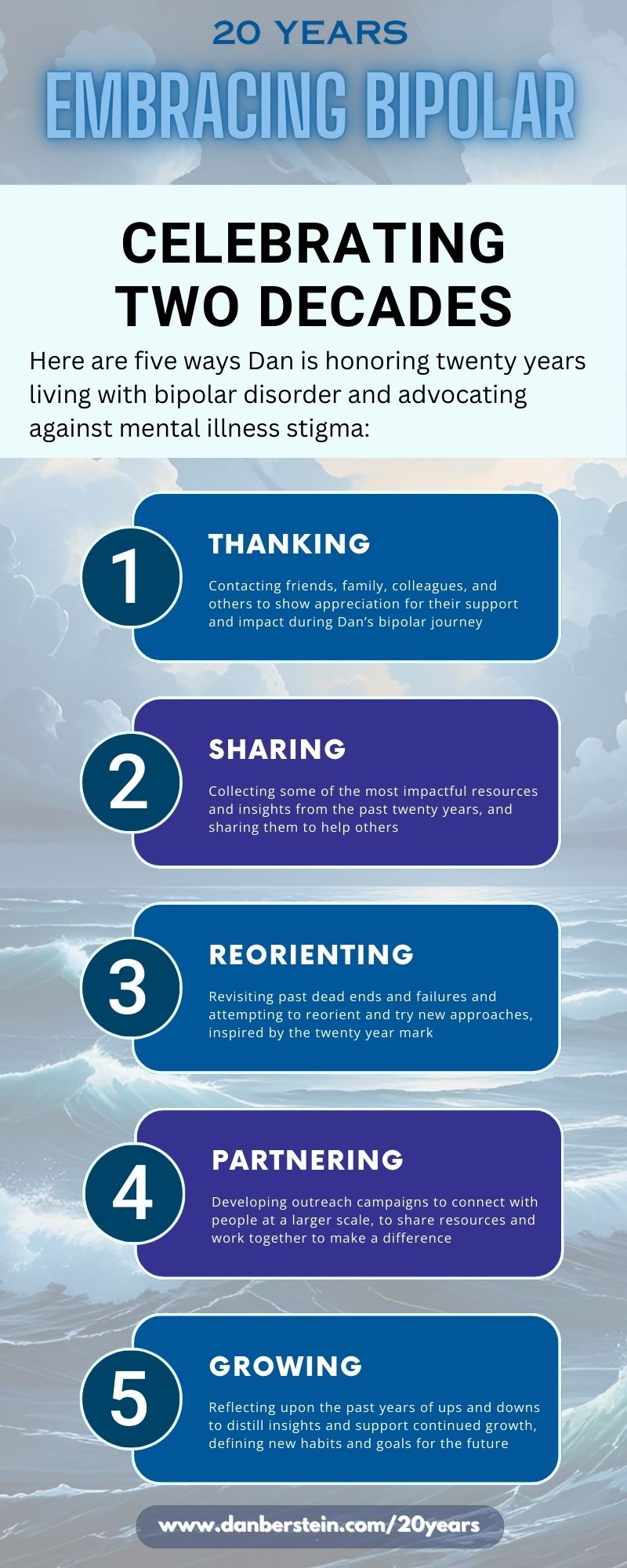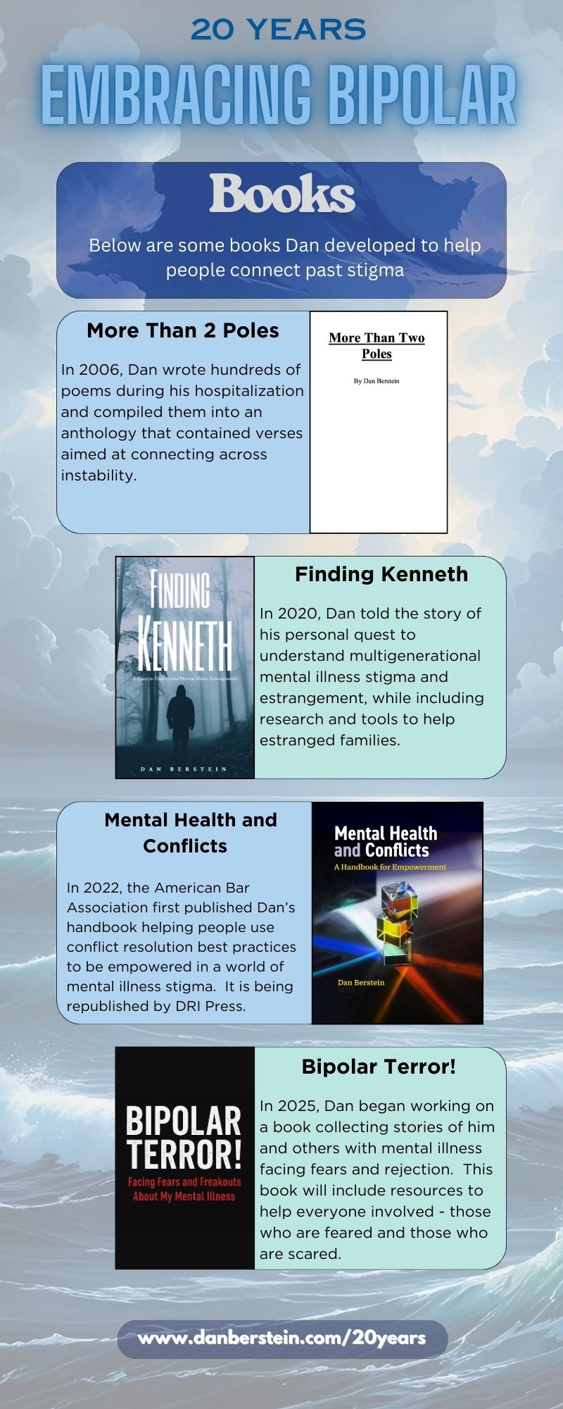 I’m Dan Berstein, and I’ve been living with bipolar disorder for two decades. I created this site in honor of my twentieth anniversary, in the hopes of sharing resources to help others.